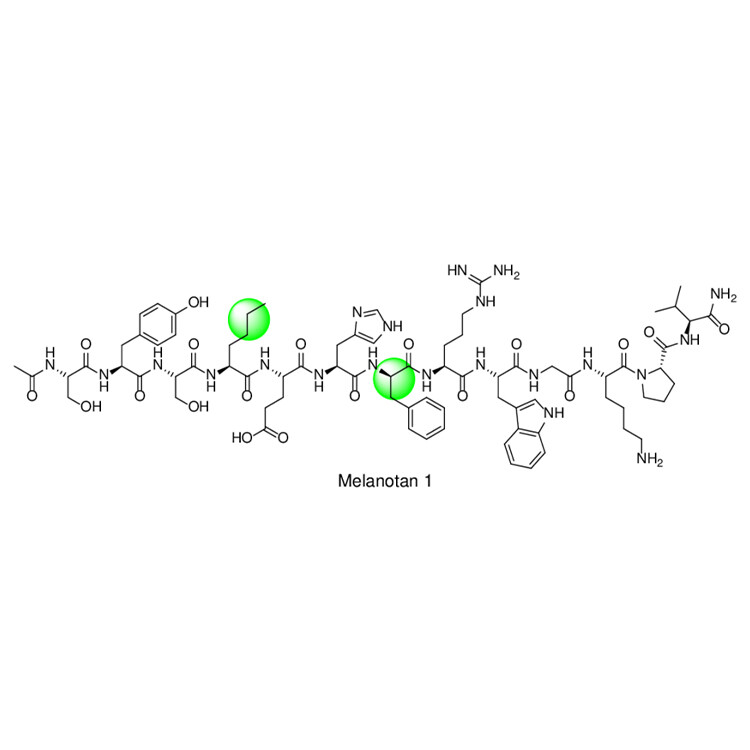 3、Melanotan-I, also known as Afamelanotide, is a synthetic analog of α-MSH (α-melanocyte-stimulating hormone). Its primary mode of action involves activating melanocytes in the skin to promote the production of melanin, resulting in a darker complexion. This protein hormone functions in the body similarly to naturally occurring α-MSH. The molecular design of Melanotan-I enables it to mimic the activity of natural α-MSH, thereby stimulating melanocytes in the skin to produce melanin. This medication is commonly used in treating skin conditions such as uneven pigmentation and sun sensitivity. By binding to receptors on melanocytes in the skin, it enhances the synthesis and secretion of melanin.